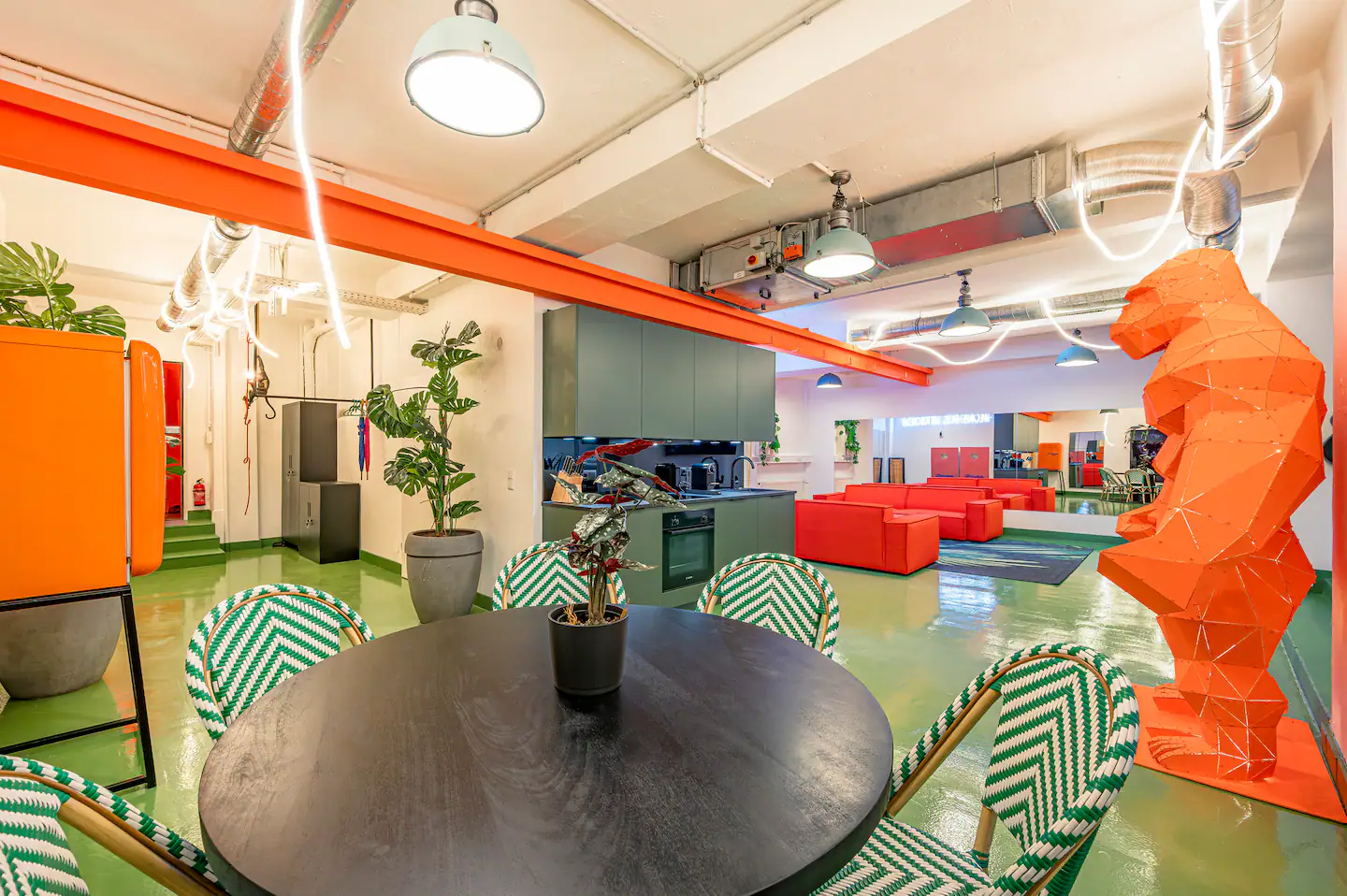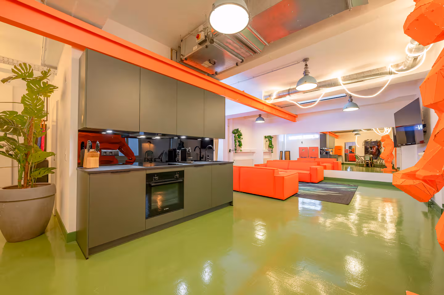 Das Loft bietet eine voll ausgestattete Küche, einen Arbeitsplatz und einen großen 86-Zoll-TV für entspannte Abende. Durch die großzügige Fläche von über 100 m² ist auch ein längerer Aufenthalt angenehm, weil man nicht auf engem Raum lebt.